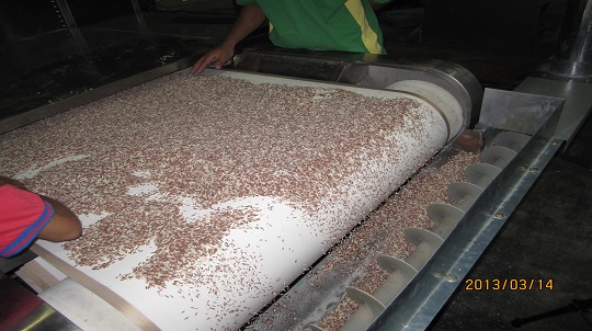 Adopt microwave belt dryer special microwave processing method for rice disinfection treatment. The traditional practice used to control the weevil infestation is treating rice with chemical fumigation using Methyl Bromide or Phosphine. Compared to traditional chemical fumigation, microwaves can safely thoroughly kill adult weevils, eggs mould under low temperature, without any residues of chemical fumigation. Microwave energy penetrates rice vibrates the water molecules of weevils, then kills all adult weevils, even larvae, eggs pupae.